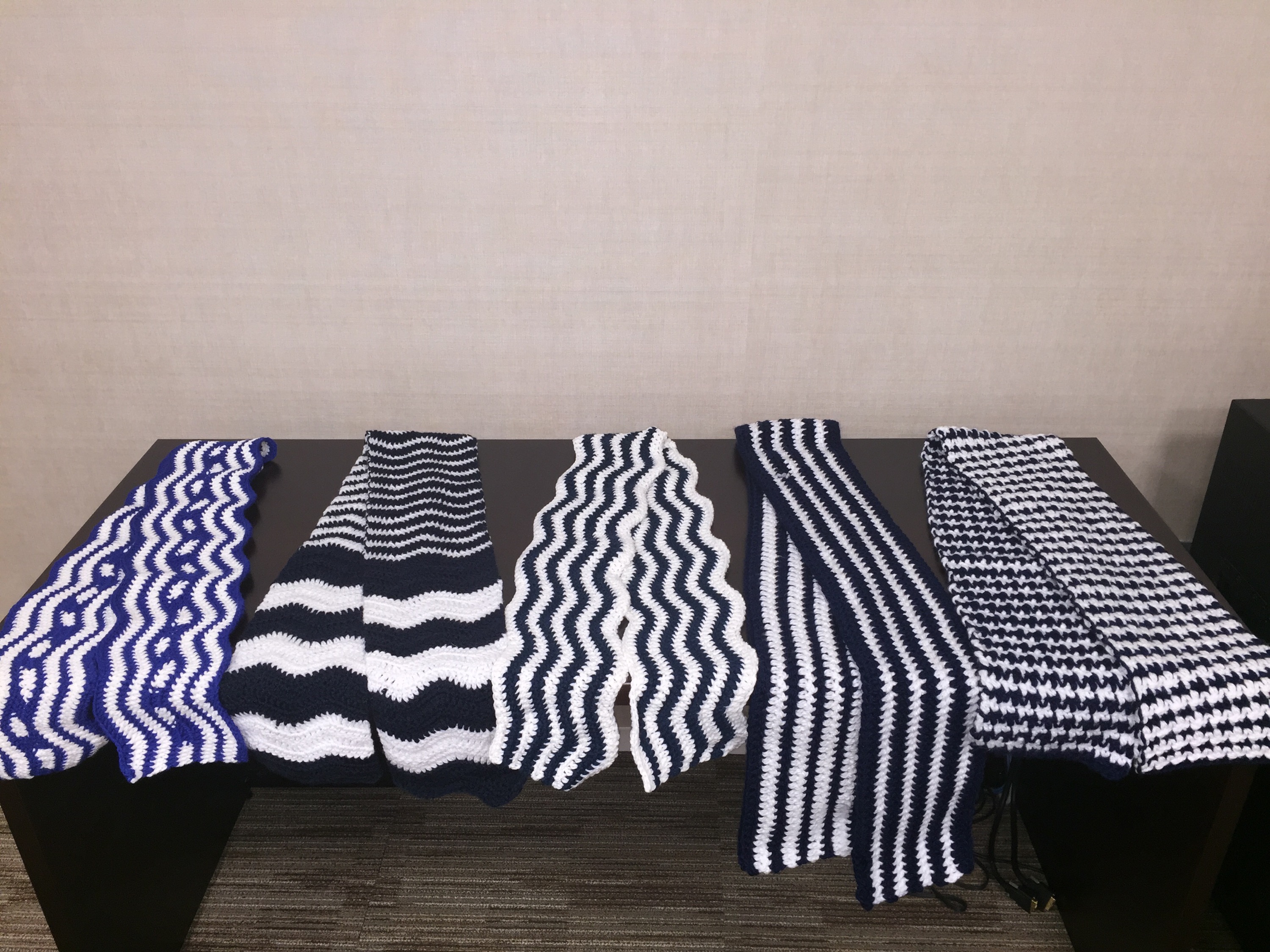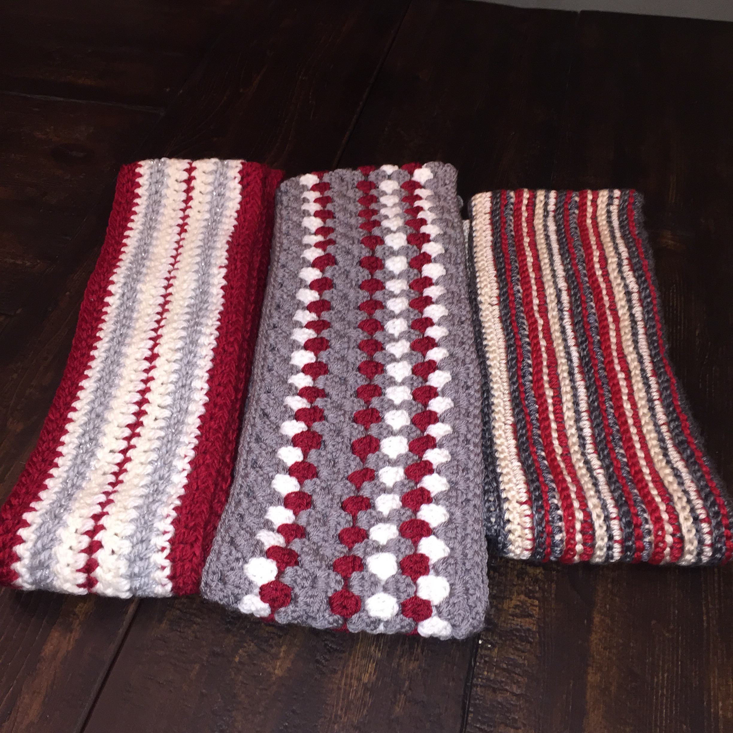 I have also been working on scarves for the 2017 Special Olympics Winter Games. Great colors this year: cranberry, ivory and grey. Scarves 1-3: