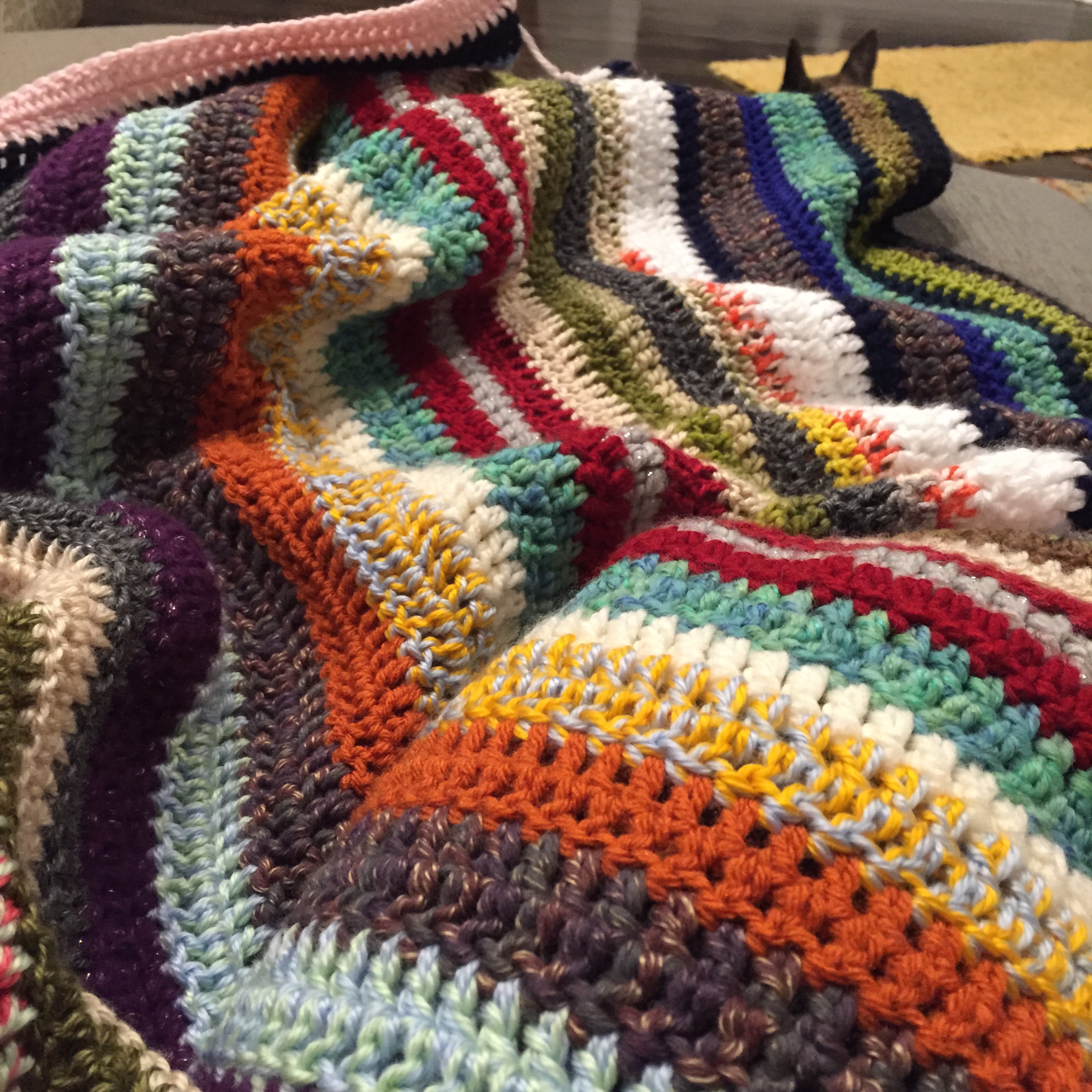 And finally…. I present to you “Franken-Blanket”. The quilter in me cannot resist scrappy things so I decided to take all of my scrap yarn and make a scrappy afghan. Truth be told, I had very little scrap yarn so a lot of this is new. I let the hubs pick out new yarn each weekend and my momma send me yarn 🙂